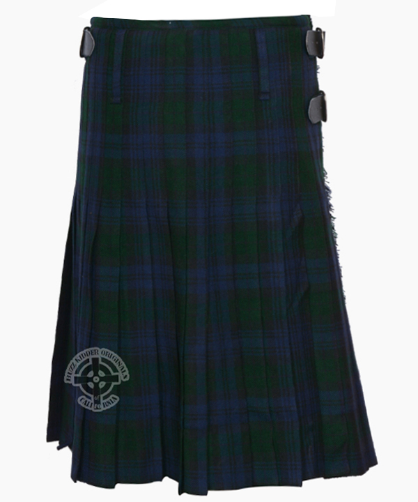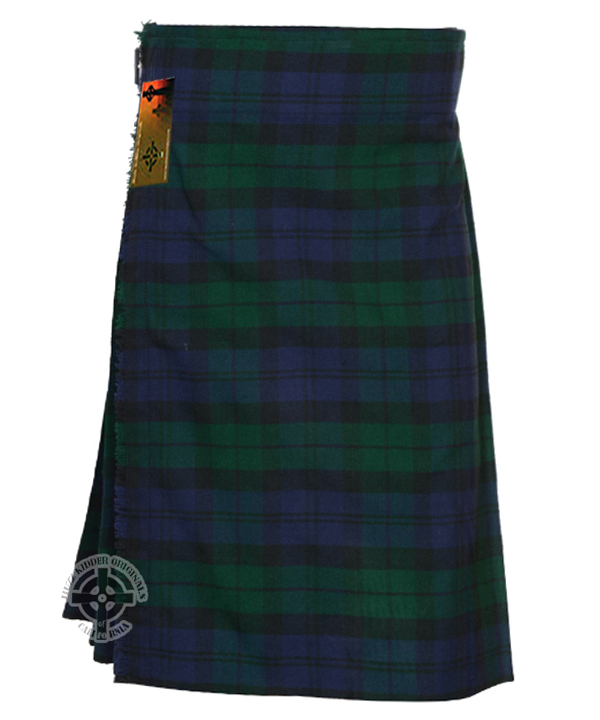 Our all-season Black Watch 8 yard “OK”, Original Kilt, 80% acrylic + 20% wool kilts are amazingly soft and the 24-36 one inch rear pleats look great and hold their shape for a perfect fit. Each kilt is made from a generous ~8 yards of 12 oz. to 13 oz. fabric that gives a weight & year round comfort that you can feel in any season. Our 8 yard “OK” 80/20 Kilts are pleated to the sett, so that the tartan pattern is preserved in the pleating and the “OK” 80/20 has a smooth front that displays the full tartan pattern, 2 belt loops and 3 belt buckles , 1 in the inner apron and 2 on the outer. Standard length is 24″, custom sizing is available