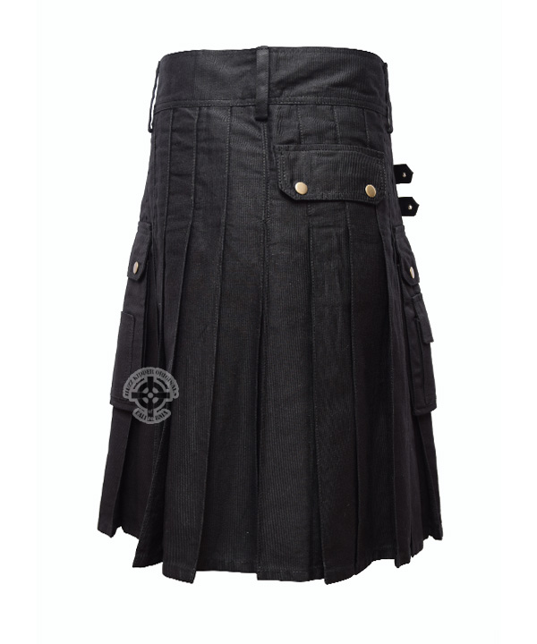 Modern Black Utility Kilt With 2 strap and adjustable brass snaps , 2 side pockets and one back pocket brass metal parts