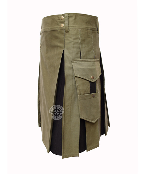 Olive and Black Cotton Hybrid Decent Box Pleat Utility Kilt Attached pockets, nice Fitting and Brass Antique Snaps